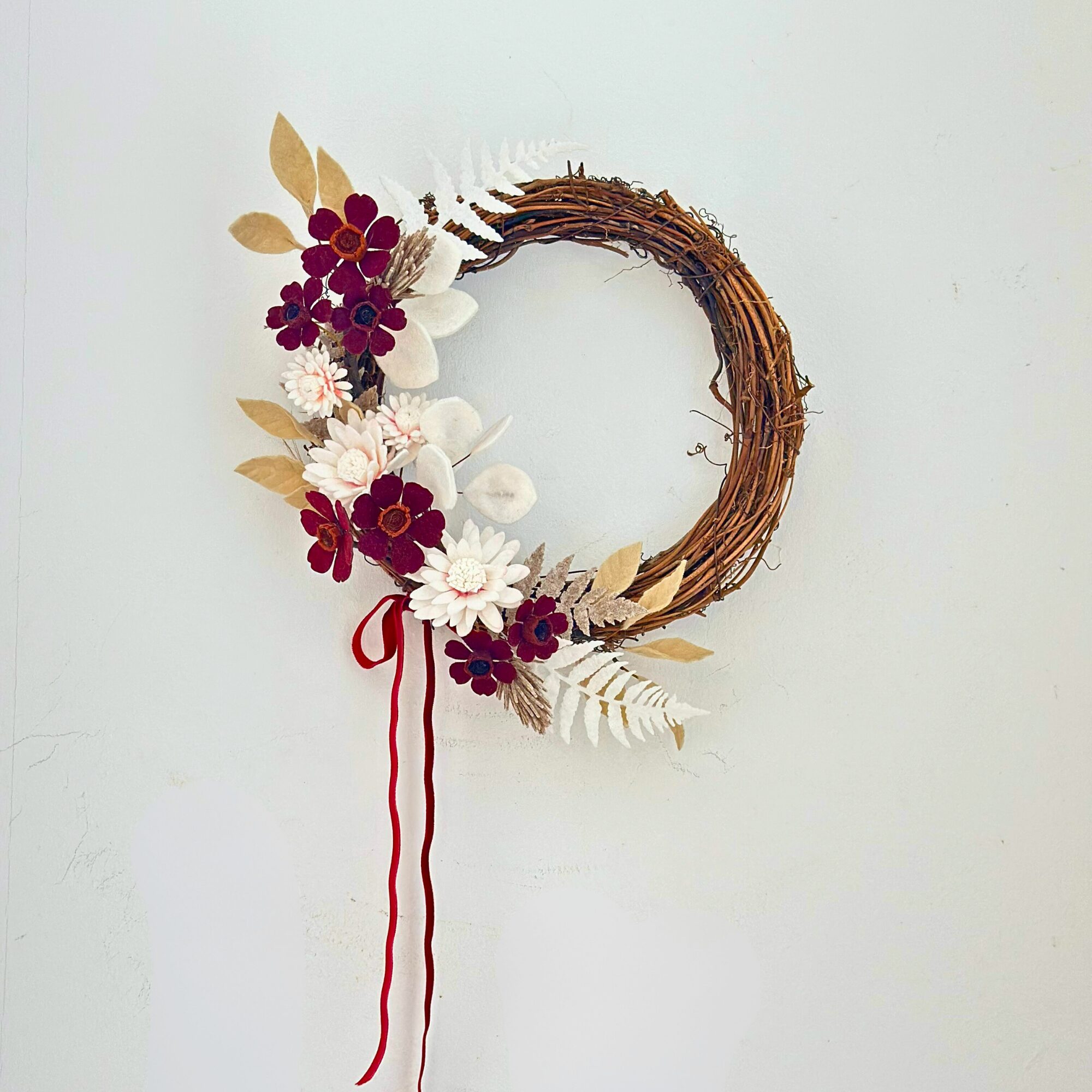 Bring warmth and modern simplicity to your space with this handcrafted felt flower wreath, created to celebrate the quiet beauty of nature. Each piece has been gently shaped and arranged on a natural vine base, then finished with a soft velvet ribbon for a touch of understated elegance.